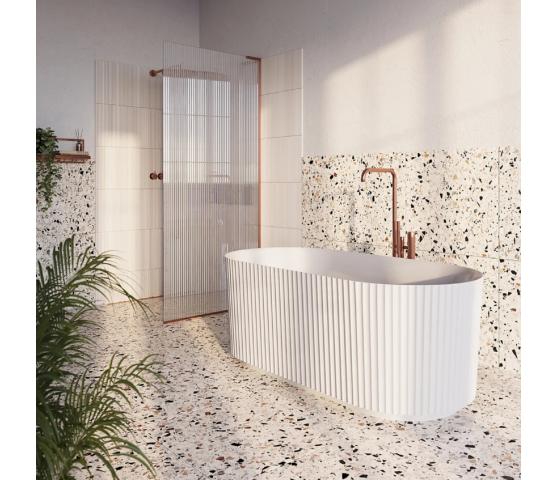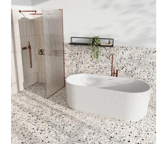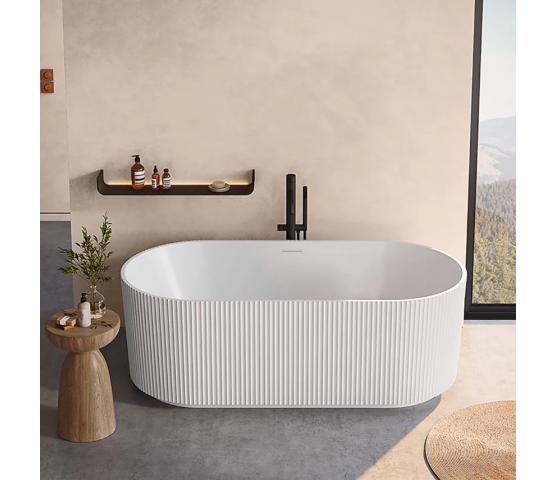 Leonora er et ovalt frittstående badekar i moderne design. Den rillede fronten gir et meget elegant og iøyenfallende uttrykk som skiller seg ut. Arundet, elegant og ergonomisk utforming som gir meget god sittekomfort. Badekaret kan monteres inntil vegg med veggmontert armatur, eller midt i rommet med frittstående armatur.