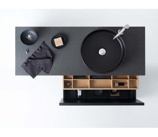Servantskap med hel skuffefront med rominndelt skuff på innsiden og åpen oppbevaring. Detaljer i massiv eik. TX Top Extreme™.