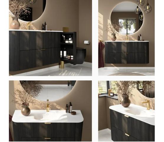 Fronten Rille har en smal spileprofil som skaper et diskret spill og gir møbelet dybde og karakter. Resultatet er et naturlig og tidløst uttrykk som passer like godt til moderne som klassiske baderom. Rille-fronten leveres i eik finér, sort eik finér og valnøtt finér.