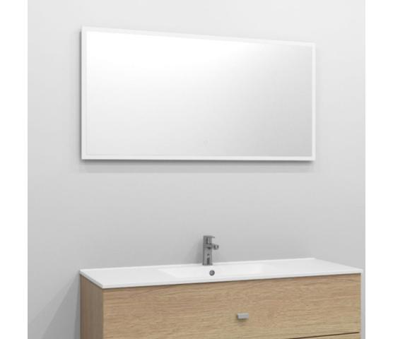Tynne plexiglasskanter med LED-lys, opplyst av/på-sensor i speilet, og bryter for å endre lysfarge mellom 4000K og 6000K. Antidugg-funksjon, 220V, CE, IP44.