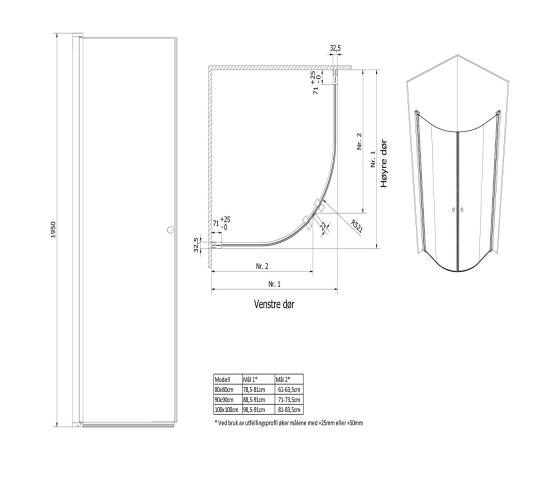 Målene er oppgitt i ytterkant veggprofilmål, husk å sjekk installasjonsveilederen eller dusjkalkulatoren for å se hvilken dusjløsning som passer ditt bad.