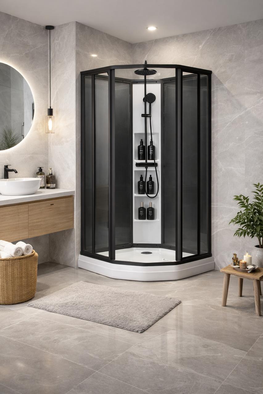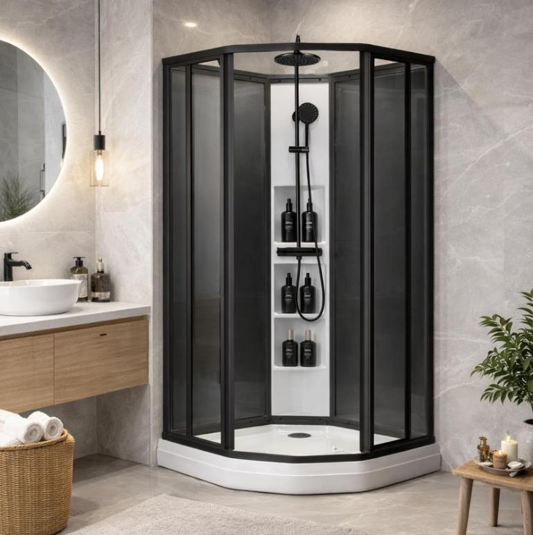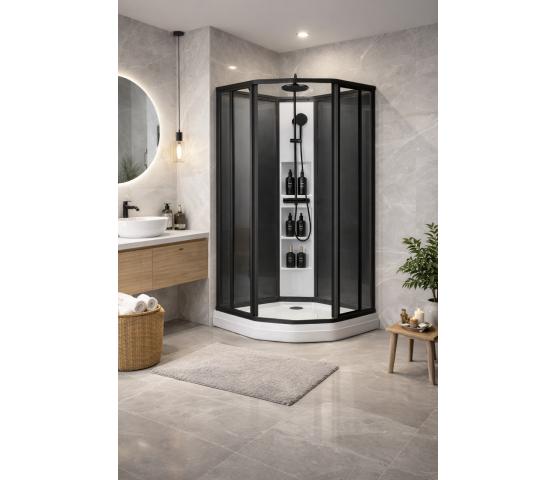 Sanipro Plus Classic sort leveres med matt sorte profiler og sotet glass i bakveggene.