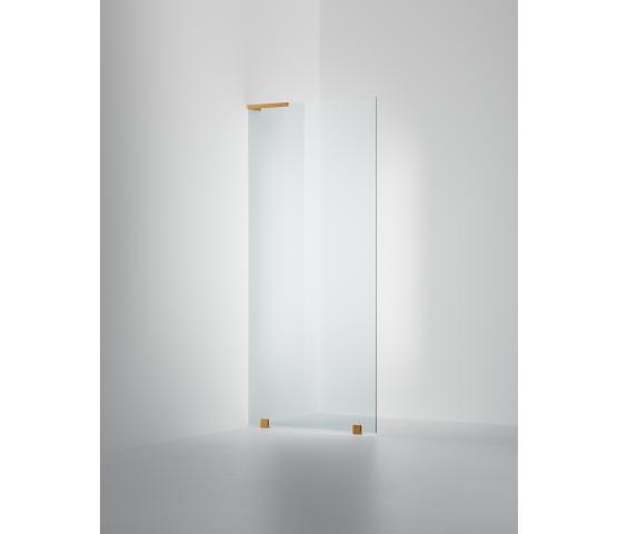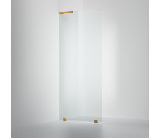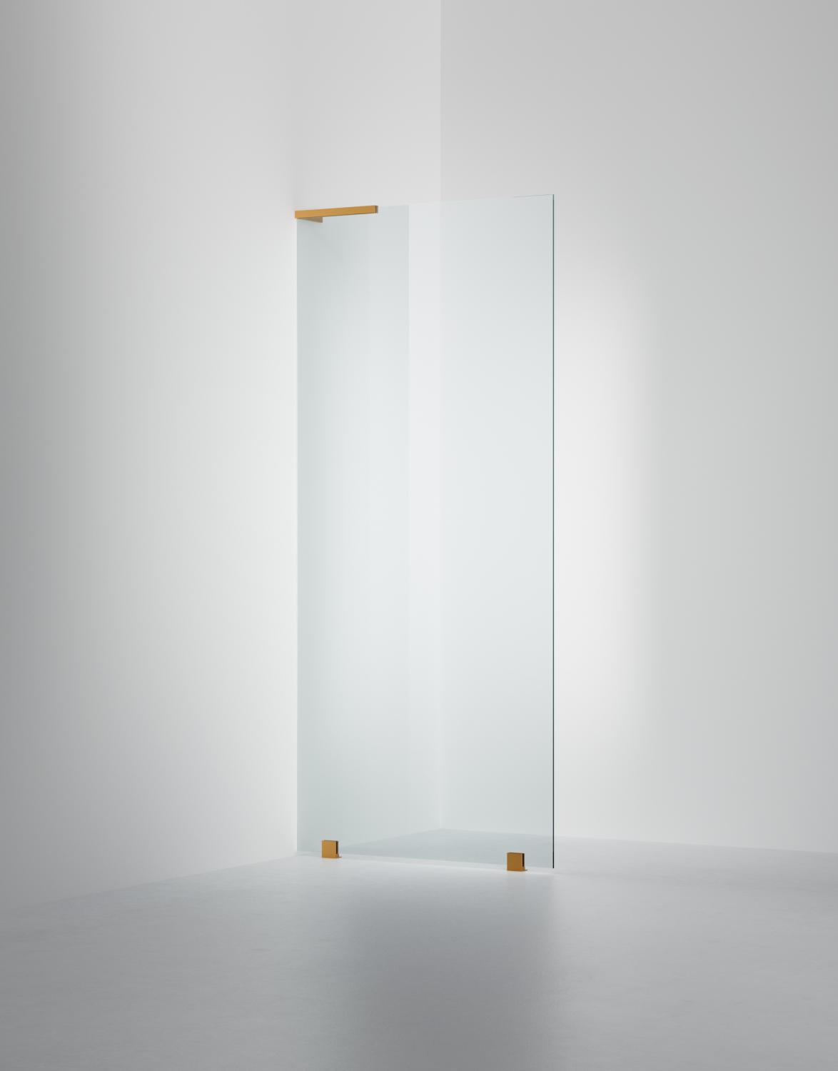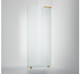 Lekker fastvegg som leveres i målene 800 eller 900 mm. Kan også bestilles som måltilpasses innen størrelsen 400-1200 mm. Ta kontakt vis det er ønskelig. Her er modellen i klart glass og Brushed Brass profil.