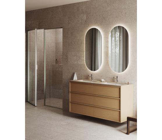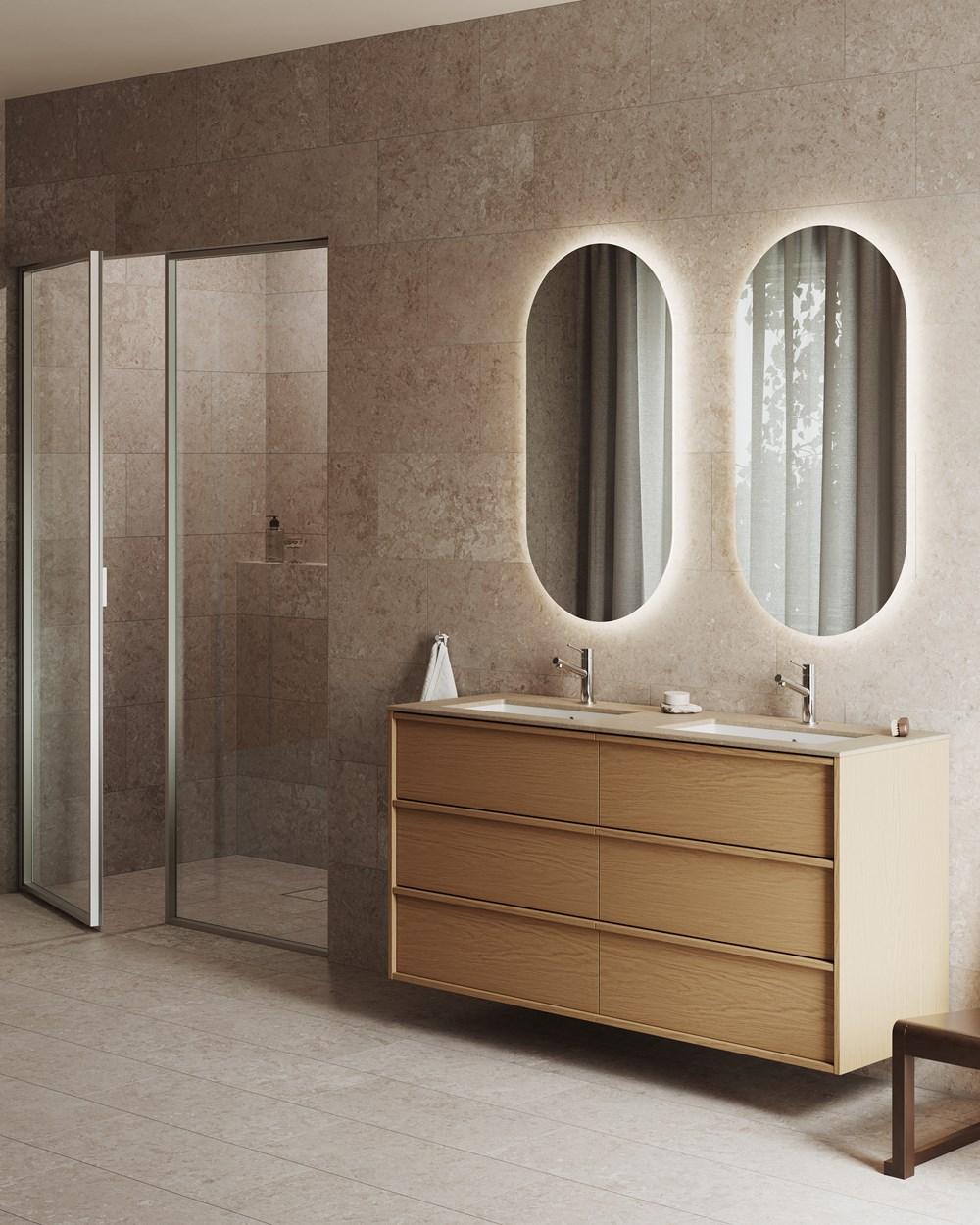 Hver nyanse og hver struktur er resultatet av et nøye arbeid, der balanse og samspill har vært like viktige som det visuelle uttrykket i seg selv. Designet har hele tiden tatt utgangspunkt i helheten. Granittkeramikken er utviklet for å fungere sammen med våre finérer, dusjglass og metalloverflater – slik at baderommet oppleves som et helhetlig miljø.