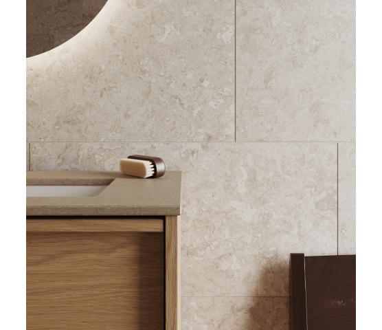 Designarbeidet bak vår granittkeramikk tok utgangspunkt i drømmen om kalkstein. Om det milde uttrykket, de levende overflatene og de naturlige variasjonene – og om hvordan denne følelsen kunne få plass i baderommet, uten begrensningene som naturstein ofte innebærer. Med gotlandsk kalkstein og kalkstein fra Öland som referanse, arbeidet våre designere steg for steg frem mønstre, strukturer og fargetoner som fanger steinens karakter. Ambisjonen var ikke bare at flisene skulle se ut som naturstein, men også at de skulle føles som stein – med en overflate som oppleves taktil og levende under fingertuppene.
