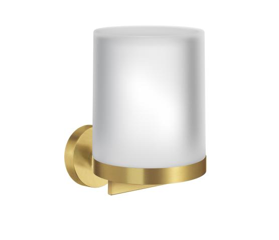 Stilig vegghengt såpedispenser med holder og bakplate i børstet messing og beholder i frostet glass. En stilig såpedispenser gir badet en følelse av design og funksjon. Samtidig er dispenseren et praktisk baderomstilbehør som gjør badet ekstra hygienisk. Gjestene dine vil garantert sette pris på en såpedispenser på gjestetoalettet. Beholderen rommer 150 ml og henges på veggen for å frigjøre plass på vasken.