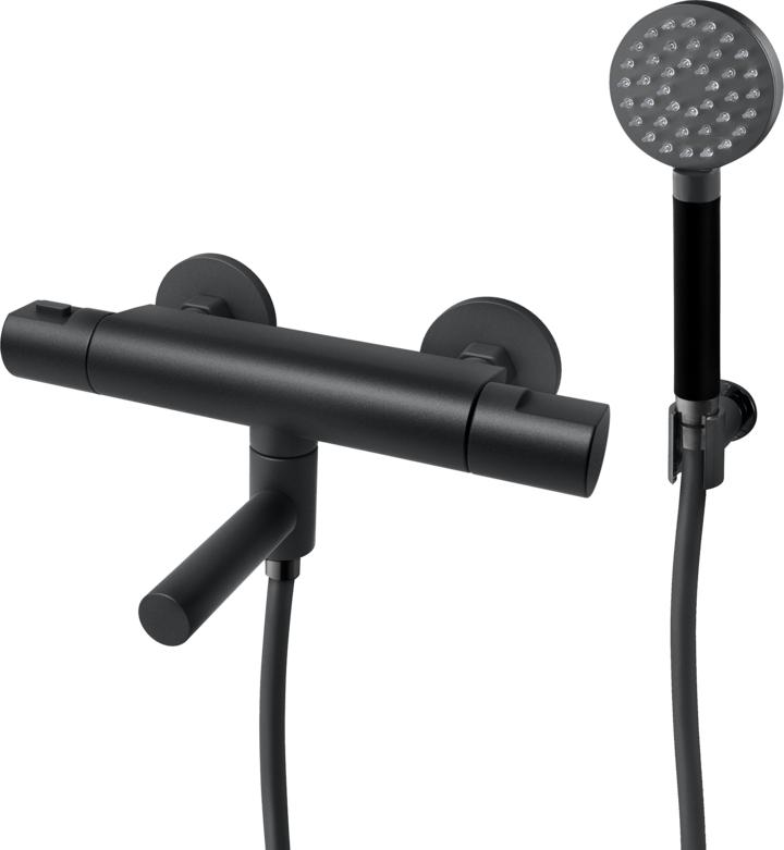 Badekarbatteriet Arm026 har sylinderformet kropp, og finish i sort matt, som sørger for at det passer perfekt i alle stilrene og moderne baderom. Hånddusj og, veggfeste og slange følger med.