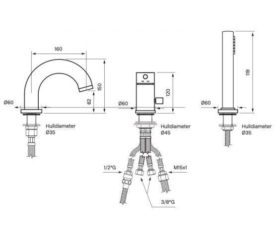 Dusj- og badekarbatteri med hånddusj. 3 hull. For karkantmontering.