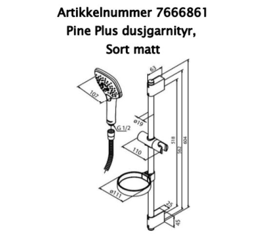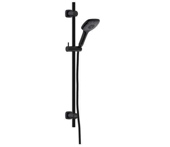 Dusjgarnityr med fleksibelt veggfeste, maks avstand 740mm. Tre innstillinger på stråle. Sparedyse i hånddusj som enkelt kan fjernes. Sort matt slitesterk overflate.