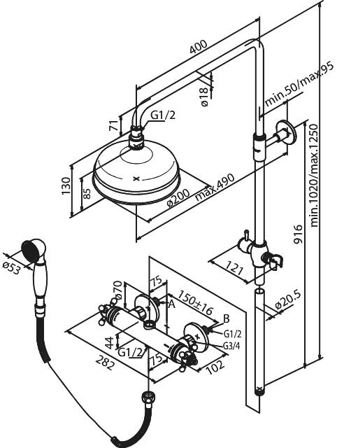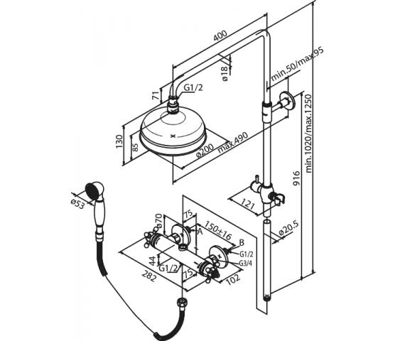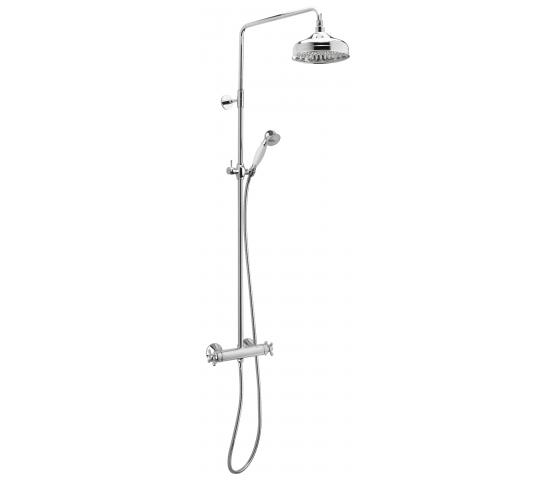 Nostalgisk takdusj med 200mm dusjhode. Hånddusj med porselensdetaljer. Justerbar høyde på stang 1020-1250mm. Eco-save og skoldesperre på termostatkran. Metallslange med anti-twist.