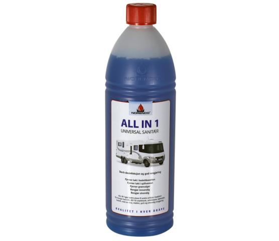 Brukes overalt i og utenpå campingvognen/bobilen. All in 1 gjør bedre plass til andre artikler i bobilen – du trenger bare All In 1 til septiktank, avfallstank, kjøleskap, toalett, vask av dusj, bord, gulv og utvendig rengjøring.